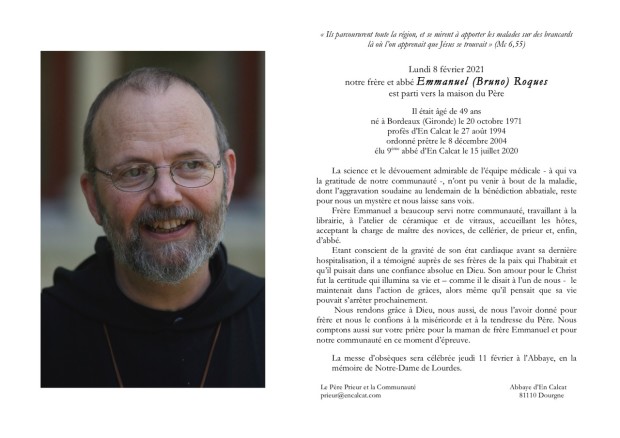 Accueil » Nos archives » Le nouveau père abbé d’En-Calcat, RIP Perepiscopus Le nouveau père abbé d’En-Calcat, RIP Elu le 15 juillet 2020 père abbé, le père Emmanuel s’est éteint le 9 février à l’âge de 49 ans. Article précédentLe Torpt (Eure) : l'église bientôt comme neuve Article suivantNotre-Dame de Paris : pas terminée avant 2025 ? 13 février 2021
