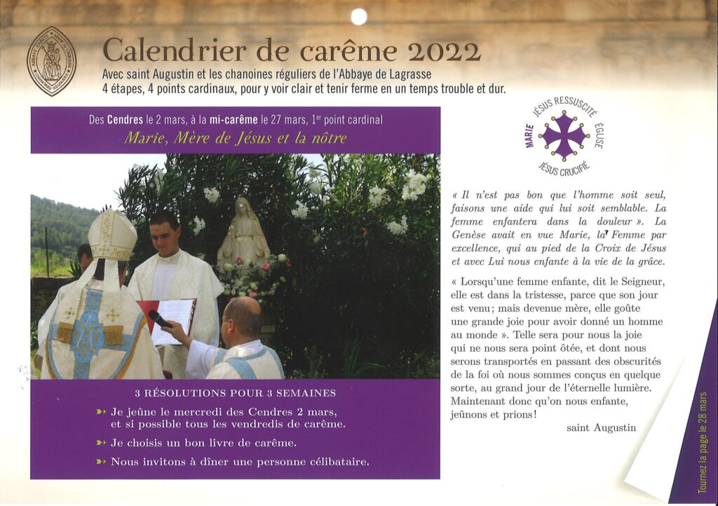 Accueil » Nos archives » Calendrier de Carême (1) Summorum Pontificum Calendrier de Carême (1) Les Chanoines Réguliers de la Mère de Dieu (Abbaye de Lagrasse) ont publié de Carême avec quelques pensées spirituelles et quelques bonnes résolutions jusqu’au dimanche de la Sainte-Trinité. Abbaye de Lagrasse Article précédentAgenda: Pèlerinage annuel du Mouvement catholique des familles le 12 mars Article suivantFranc succès pour la récollection scoute du Barroux (février 2022) 6 mars 2022