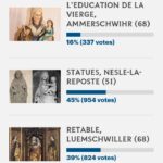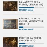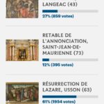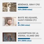 A ce jour, la Vierge de Saint-Abraham en Bretagne et le retable de Bernay Neuvy-en-Champagne (Sarthe) sont en tête dans les deux régions de l’Ouest. Pour les autres régions, voilà les oeuvres en tête.