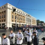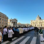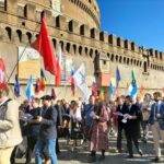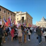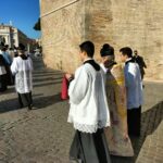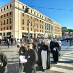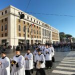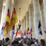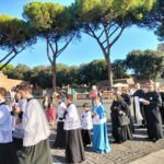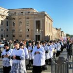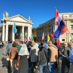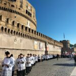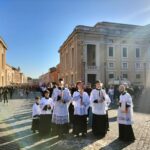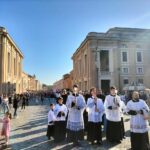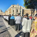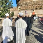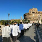 Les pèlerins du Pèlerinage Ad Petri Sedem sont arrivés en fin de matinée à la basilique Saint-Pierre de Rome, après avoir entonné des chants, dont celui du credo, dans le sillage de la procession débutée a l’église Saint-Celse et Saint-Julien (ICRSP) face au château Saint Ange.