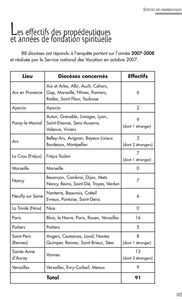 Voici les effectifs en propédeutiques diocésaines en 2008; ce tableau est issu d’un rapport établi à l’époque pour la CEF. Aujourd’hui, nombre d’entre elles ne donnent même plus les effectifs, ou de façon vague.