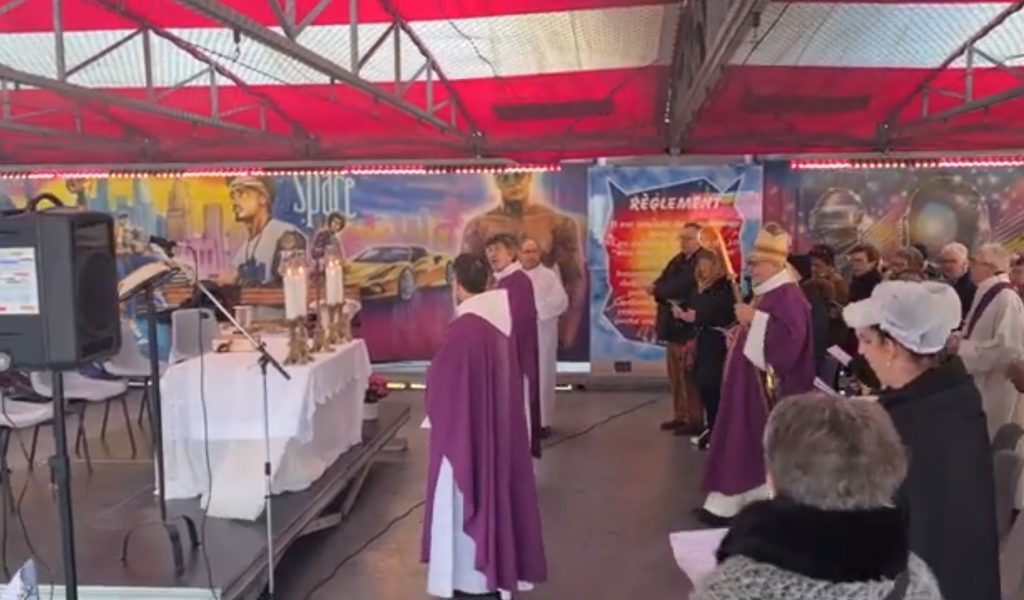 Un autel et un évêque parmi les autos-tamponneuses, c’était ce 15 février la messe de Mgr Cador à la fête foraine de Granville, juste devant la gare. La cité normande a pourtant plusieurs belles églises, dont Saint-Paul située à 600 M de la gare de Granville, mais pourquoi faire ?