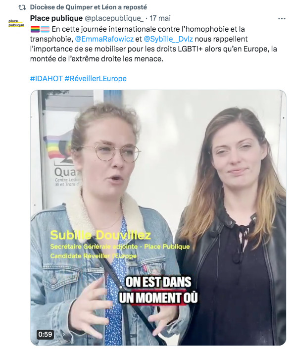 Le 17 mai, le compte X (ex-Twitter) du diocèse de Quimper et Leon retweetait la propagande LGBT, appelant à se mobiliser pour les droits LGBTI+… Dans le jargon, cela signifie que le diocèse milite pour la dénaturation du mariage, la privation de père ou de mère pour des enfants, la vente d’enfants par GPA, l’idéologie du genre… :