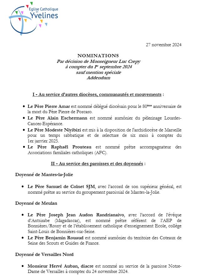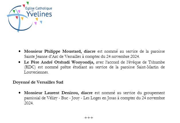 Accueil » Nos archives » Versailles : nominations diocésaines complémentaires Église en France Versailles : nominations diocésaines complémentaires Des nominations diocésaines complémentaires sont parues dans le diocèse de Versailles en novembre dernier : Article précédentLa Croix suspend ses publications sur le réseau X Article suivantUn nouvel oblat pour l'Institut du Christ Roi 11 février 2025