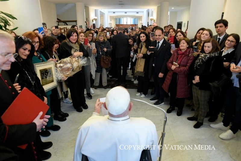 Je suis particulièrement heureux de vous accueillir, sages-femmes, gynécologues et professionnels de la santé de Calabre. Votre profession est très belle, elle est une vocation et un hymne à la vie, d’autant plus important en ce moment historique. En effet, en Italie, mais aussi dans d’autres pays, il semble que nous ayons perdu l’enthousiasme pour la maternité et la paternité ; nous les considérons comme une source de difficultés et de problèmes, plutôt que comme l’ouverture d’un nouvel horizon de créativité et de bonheur. Et cela – nous le savons – dépend beaucoup du contexte social et culturel. C’est pourquoi vous, en tant qu’Ordre professionnel, vous vous êtes donnés un objectif programmatique : inverser la tendance à la dénatalité. Bravo ! Je vous félicite. Je voudrais maintenant réfléchir avec vous sur trois domaines complémentaires et interdépendants de votre vie et de votre mission : le professionnalisme, la sensibilité humaine et, pour ceux qui croient, la prière.