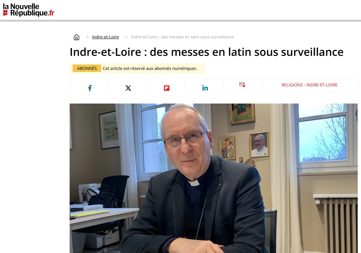 Le 26 février, le journal La Nouvelle République a publié une série d’articles sur les fidèles attachés à la messe traditionnelle en Touraine : Messes en latin en Indre-et-Loire : « On vient pour le sens du sacré », des messes en latin sous surveillance ou encore En Indre-et-Loire, les écoles catholiques hors contrat se déploient. (Disponible intégralement pour les abonnés au journal)