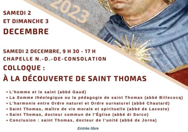 Organisé par l’Institut universitaire Saint-Pie X de Paris, le colloque « A la découverte de saint Thomas » se déroulera les 2 et 3 décembre prochains à la chapelle Notre-Dame de la Lire la suite ...