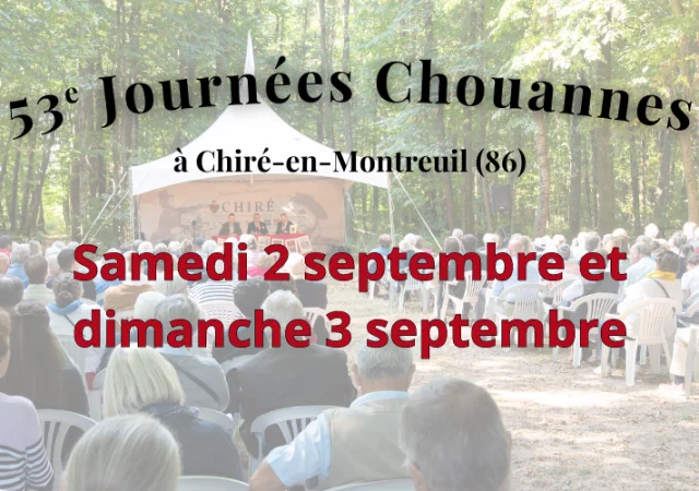 Les éditions de Chiré vous convient à leurs 53èmes Journées Chouannes à Chiré en Montreuil les 2 et 3 septembre en présence de nombreux auteurs.