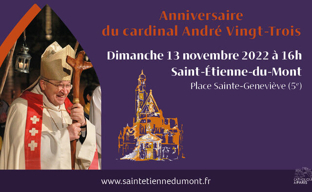 Le cardinal André Vingt-Trois aura 80 ans le le 7 novembre. A cette occasion, il fêtera son anniversaire en l’église Saint-Étienne du Mont, 13 novembre à Paris à 16h00.