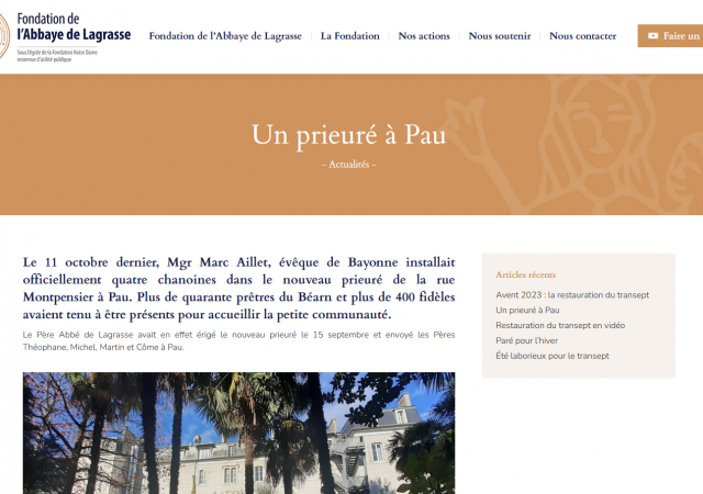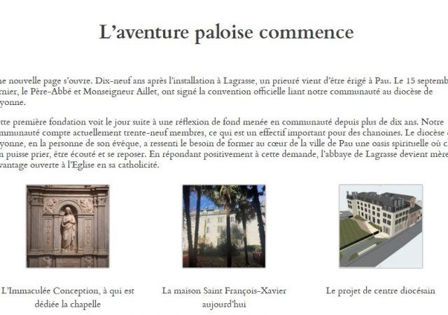 Les Chanoines Réguliers de la Mère de Dieu (Abbaye de Lagrasse) ont une nouvelle mission à Pau (Diocèse de Lescar Oloron Bayonne) où ils viennent de fonder un nouveau prieuré.