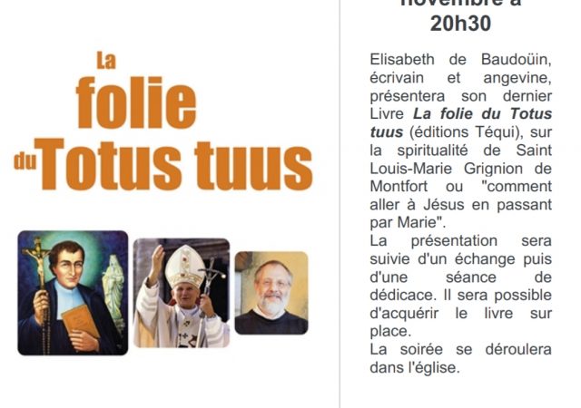 Elisabeth de Baudouin va présenter à Notre-Dame des Victoires d’Angers, le 18 novembre à 20h30,son livre sur la spiritualité de saint Louis Marie Grignon de Montfort, La folie Lire la suite ...
