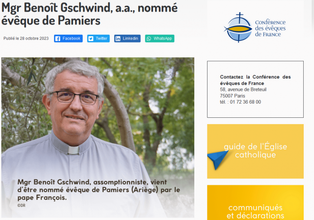 Le Pape François a nommé Mgr Benoît Gschwind, évêque de Pamiers ce 27 octobre :