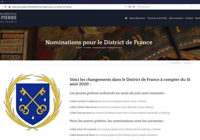 Le site du district de France de la Fraternité Sacerdotale Saint-Pierre publie les nominations des prêtres et diacres à partir du 15 août.
