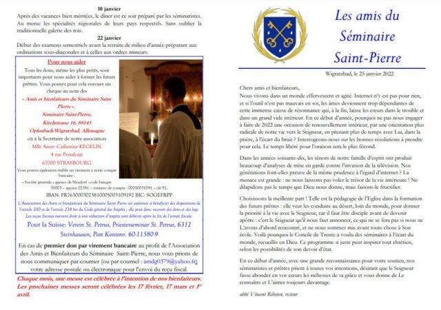 Le Séminaire Saint-Pierre (FSSP) publie deux fois par an une lettre aux Amis pour donner quelques nouvelles du Séminaire. Dans son éditorial, l’abbé Vincent Ribeton, FSSP, Lire la suite ...