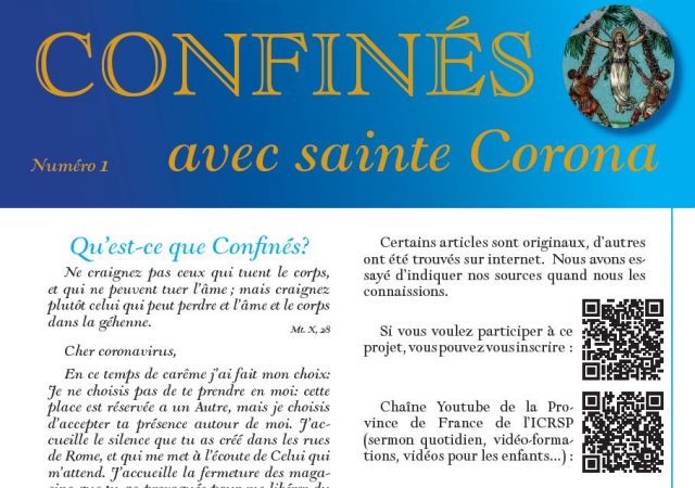 La Province de France de l’Institut du Christ Roi, outre sa chaine Youtube, propose un petit journal hebdomadaire d’une quarantaine de pages, intitulé « Confinés Lire la suite ...