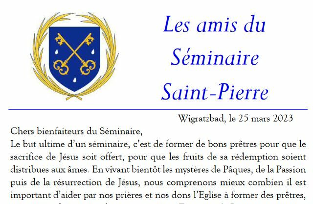 La dernière lettre aux Amis et Bienfaiteurs du Séminaire Saint Vincent de Paul (Courtalain), séminaire de l’Institut du Bon Pasteur, vient de paraître (Juin 2024) et évoque Lire la suite ...
