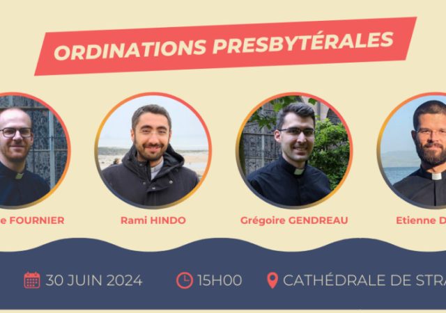 Quatre nouvelles ordinations sacerdotales auront lieu le dimanche 30 juin à 15h à la cathédrale de Strasbourg. Grégoire, Maxence, Rami et Étienne seront ordonnés par Mg Pascal Lire la suite ...