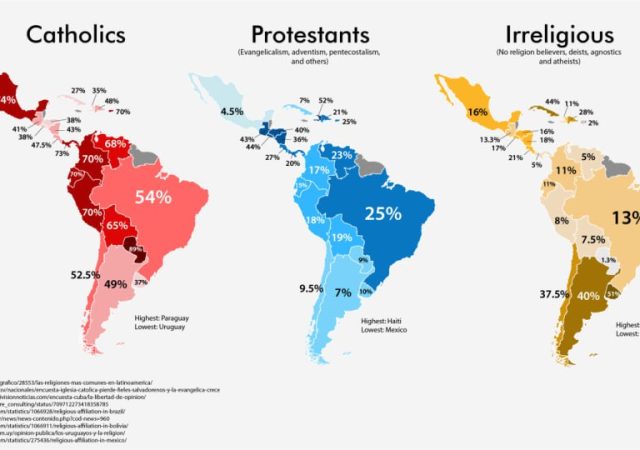 Voici une carte de 2023 du pourcentage d’habitants des pays d’Amérique latine et centrale qui se disent catholiques (en baisse), évangéliques (en hausse) et évangéliques Lire la suite ...